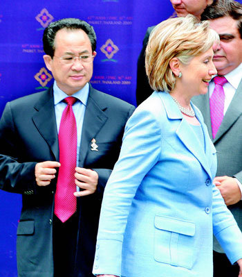 23日閉幕的第16屆東盟地區論壇(ARF)上,朝鮮大使朴根光(左側)在美國國務卿希拉蕊•克林頓經過身前時回避視線。希拉蕊•克林頓在ARF上警告朝鮮:“若朝鮮不回到六方會談談判桌上,將面臨國際社會的制裁和孤立。”