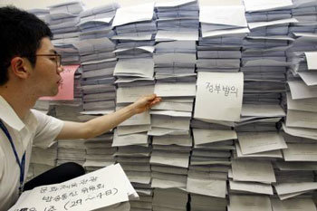 上周臨時國會雖然結束了,但是執政黨和在野黨還圍繞著媒體相關法的合法型進行攻防戰。國會辦公室職員27日正在國會議案科整理還未被處理的堆放在一起的法案資料。