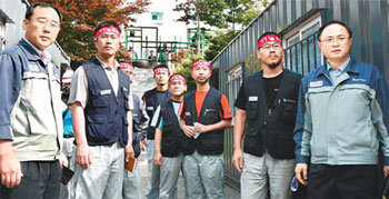 30日,進行協商之前的雙龍汽車公司和工會代表們,在平澤市雙龍汽車工廠臨時搭建的集裝箱前共同面對鏡頭。當天上午9點20分,在這座集裝箱裡面準備的談判桌上,他們雙方展開了最終交涉。