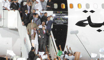 蘇格蘭司法當局8月20日釋放了因製造洛克比空難而在蘇格蘭服刑的利比亞人阿卜杜勒•邁格拉希(第一排右側)。當天,有數千民居民來到利比亞的黎波里首都機場,舉著國旗迎接邁格拉希回國。