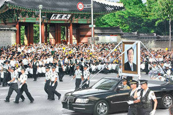 23日,金大中前總統的葬儀車輛正經過首爾市內的德壽宮大漢門前。18日病逝的金前總統的國葬23日在首爾汝矣島國會廣場舉行,接著其葬儀車輛經過金大中東橋洞的宅邸、金大中和平中心和首爾廣場等地。當天,有2萬多名市民參與路祭,並舉著黃色氣球送金前總統最後一程。