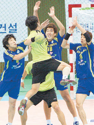 本月25日,忠南道廳隊的金泰完(音),于水原室內體育館舉行的手球超級聯賽男子組比賽中,面對仁川城市開發公司隊的防守,準備射門。當天,仁川城市開發公司以23比17獲勝。