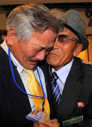 26日下午,在金剛山會議所舉行朝韓離散家屬團聚活動。韓國的李正浩(76歲•左側,音)抱著國軍俘虜出身的哥哥李快錫(79歲,音)哭泣。過了59年之後才能與弟弟見面的李快錫一聽到母親13年前去世的消息,痛哭道:“我每時每刻都在惦記著母親。”