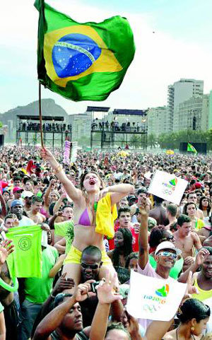 2日在丹麥哥本哈根舉行的第121屆國際奧會(IOC)全會上,當聽到裡約熱內盧打敗西班牙馬德里取得奧運舉辦權的消息時,在巴西科爾科瓦多海邊等待2016年夏季奧運會舉辦國發表結果的5萬裡約熱內盧市民揮舞著國旗,瘋狂地進行慶祝。