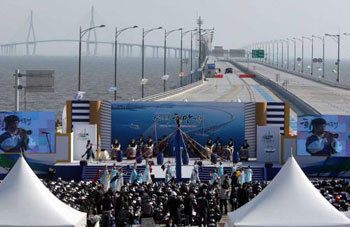 橫跨西海的仁川大橋已經竣工,在經過4年4個月的工期後,16日正式對外展現雄姿。仁川大橋全長21.38公里,連接仁川松島新都市和永宗島,其施工費達2兆4556億韓元,而且是韓國最長的大橋,同時排名世界第七位。其中,位於海面上的橋長也有12.34公里,真不愧被譽為“跨海橋樑”。