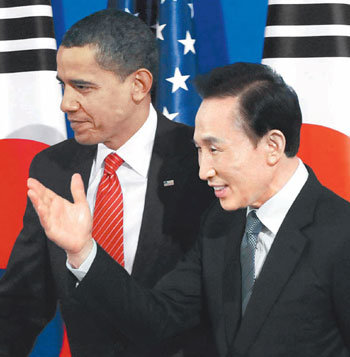 19日,李明博總統(右)和奧巴馬總統在青瓦台舉行韓美首腦會談後,結束了之後舉行的共同記者會,正一同步出會場。