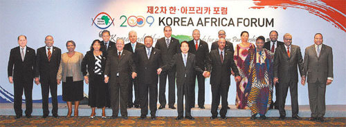24日,首爾中區小公洞樂天大廈召開了2009韓國與非洲研討會。在開幕式上,外交通商部長官柳明桓與非洲14個國家的外交長官正在攝影留念。外交通商部與非洲聯盟(AU)共同舉辦了此次研討會,AU執行委員長基恩•平與非洲53個國家的130多名高層官員出席會議,對韓國與非洲的合作方案進行了協商。1埃及;2;3 DR剛果夫婦 ;4布吉那法索;5阿爾及利亞 ;6執行委員長基恩•平;7柳明桓;8埃塞俄比亞;9未詳;10乍得;11肯雅;12南非共和國;13未詳;14摩洛哥;15貝寧;16塞內加爾;17尼日利亞;18辛巴威。