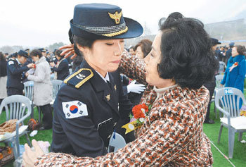 27日,在忠北忠州中央警校舉辦的新任員警1370名的畢業典禮及錄用儀式上,一位家長親自給女兒帶上肩章之後,擁抱在一起。