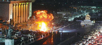 29日在首爾光華門廣場附近的世宗路,KBS2連續劇《IRIS》劇組正在拍攝汽車爆炸的場面。
