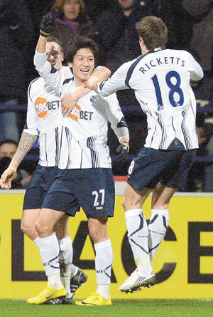 只要他打破球門,球隊就會獲勝。博爾頓的李菁龍(中間)正延續著這一令人興奮的勝利公式。在27日與伯恩利舉行的英超聯賽中,李菁龍在比賽進行到第34分鐘時踢入了決勝球。他正接受來自同伴的祝賀。