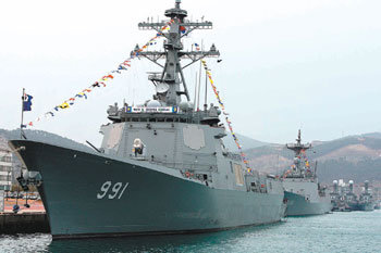 1日,在釜山海軍作戰司令部召開的第七機動戰團創立儀式上,最新銳宙斯盾級驅逐艦——世宗大王號亮出雄姿。第七機動團可獨自在全世界範圍內進行抑制戰爭和防止擴戰、保護海上交通路線等任務。世宗大王艦後方是韓國型驅逐艦崔瑩號。