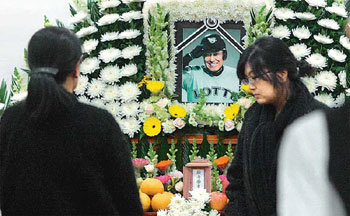 7日下午,前來弔唁的人們在江東區慶熙大學東西新醫學院葬禮場,向十年間一直以植物人的狀態接受治療,最終治療無效死亡的前樂天巨人隊球員任秀赫(音譯)表示弔唁。遺像是任秀赫選手受到病魔折磨前的最後一個賽季——2000年賽季比賽中的樣子。