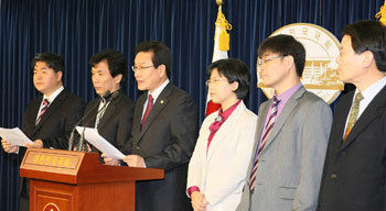 6•2地方選舉即將到來之際,由5個在野政黨和4個市民團體組成的“5+4協議體”,8日正式發表了實行無償提供伙食、強化大企業超市(SSM)限制,等12個領域的政策聯合方案。發表者(左3)是民主黨政策委員會首席副議長邊在一。