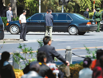 6日,訪華的金正日委員長乘坐的車輛周圍戒備森嚴。據悉,金委員長一行當天上午離開了釣魚臺國賓館,而且約一個半小時後又回到了釣魚臺國賓館。