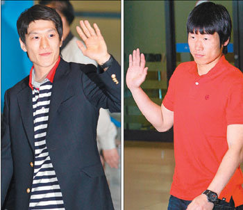 “他們回來了。”在世界足球的心臟——英格蘭超級聯賽踢球的朴智星(29歲、曼聯、左)和李青龍(22歲、博爾頓)為了參加下月11日舉行的南非共和國世界盃,於11日抵達仁川國家機場。“隊長”朴智星上身穿了件短袖,下著牛仔褲;李青龍則是穿了白色的褲子和夾克。雖然他們著裝不同,但是他們心中同樣燃燒著世界盃勝利的渴望。