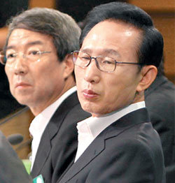 13日上午,李明博總統在首爾中區南大門路大韓工商會所召開的第八屆環保發展委員會報告大會中,同鄭雲燦國務總理一同觀察會議出席者。