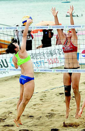 4日,在蔚山蔚州郡震河海水浴場舉行了蔚山震河世界女子沙灘排球大賽。面對著中國選手芊芊,韓國選手李珍和(左)來了個漂亮的扣球。大賽將舉行到6日,韓國、美國、日本等共9個國家10支隊伍參加此次大賽。