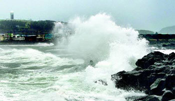 今年隨著最強烈的第七號颱風“圓規(KOMPASU)”北上,濟州西歸浦市大靜邑信島裡海岸1日掀起了像山一樣高的波浪。氣象局解释道:“圆规中心附近最大风力达到38米/秒的强烈台风。”這一颱風2日白天靠近朝鮮黃海島後,晚上則通過東海北部海脫離韓半島。氣象局從1日下午七點起向濟州島發出了颱風警報,還分別向光州、全南等地發出了颱風警報。