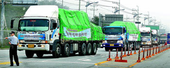 统一送粮国民运动本部的对朝粮食支援车辆17日上午为了把大米送往朝鲜,驶向了京畿坡州市韩朝出入境事务所소(CIQ)。對朝糧食支援在2007年中斷,而時隔三年後再次提供援助,而且還是李明博政府出任後的第一次。