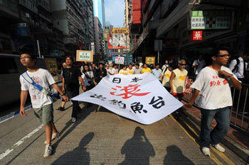 18日,香港市民高舉寫有“日本人滾出釣魚臺”的橫幅,開展了反日示威活動。當天,迎接九一八事變七十九周年紀念日,北京、上海等中國各個地區開展了反日示威活動。