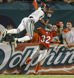 27日,於美國邁阿密進行的北美職業美式橄欖球紐約客場挑戰邁阿密的比賽中,紐約噴氣機隊的愛德華茲(上方)為了爭奪高球而躍起。下方為邁阿密海豚隊的艾倫。最終,紐約噴氣機以31比23戰勝對手。