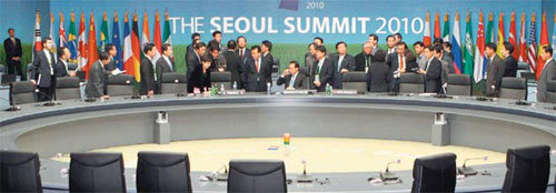 為了確認G20峰會的準備情況,6日拜訪首爾江南區三成洞COEX會場的李明博總統(中間)坐在召開峰會時自己該坐的位置上喝水。