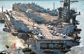 11日上午,美國海軍航空母艦卡爾•文森號駛入海軍作戰司令部釜山基地。卡爾.文森號是於1983年3月服役的“尼米茲”級核動力航母,長333米、寬40.8米、飛行甲板76.4米,共搭載24架FA-18戰鬥機、10架加油機、10架S-3A反潛機、4架EA-6B電子戰鬥機、4架E-2預警機等。此前在西太平洋地區執行任務的卡爾•文森號航母艦隊,當天是為了士兵們的休息及增加美韓友誼而訪問了韓國。卡爾•文森號將在韓國停靠到本月14日為止。