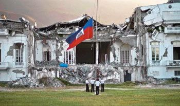 去年1月12日,海地發生7.0級強烈地震,奪走25萬人的命。12日為海地發生地震的1周年。在大地震當時崩潰的首都太子港已坍塌總統府前,聚集了數百名聯合國工作人員和各國常駐聯合國外交官。牆上懸掛著聯合國會旗,白色玫瑰和百合編織而成的花環靜靜地擺放在旗幟前方,整個大廳沉浸在莊嚴肅穆的氣氛中。全體在場人員為地震中的死難者默哀。