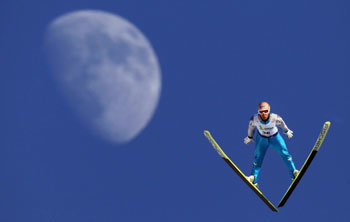 奧地利選手馬丁14日在挪威舉辦的國際滑雪聯盟(FIS) 跳雪比賽,以穩定的姿勢滑翔。除了左側的月亮外沒有任何背景,仿佛在空中飛翔。