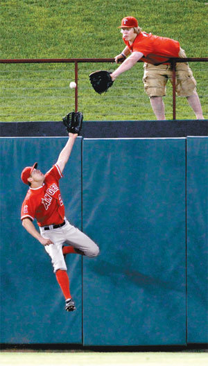 “誰先抓住了?“美國職業棒球LA洛杉磯的中堅骨幹彼得•布魯爾斯(下)在3比1領先且第7局1人出局的情況下,為了留住德克薩斯大衛•皮的本壘打球採取了柵欄打法。觀看比賽的觀眾們雖然拿出了棒球手套,但球卻進入了布魯爾斯的手套內。客隊洛杉磯天隊以4比1獲勝。