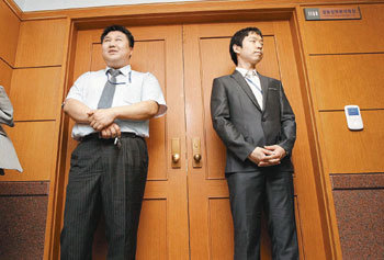 1日上午,檢方在首爾永登浦區汝矣大路金融委員會11樓金融情報分析院長室進行了搜查工作,金融委員會職員們站在被封閉的院長室門前。