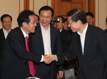 7日在首爾汝矣島召開的稅制改編黨政青(大國家黨、政府、青瓦台)會議,大國家黨代表洪准杓(左)和金滉植總理在總統室室長面前握手言和。黨政決定撤回計畫從2012年開始實行的所得稅降低方案。