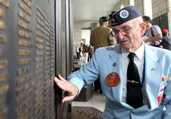 28日上午,首爾龍山區龍山洞戰爭紀念館召開首爾收復61周年紀念儀式。6.25參戰勇士正在紀念碑前撫摸戰友的名字。