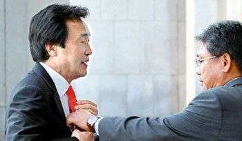 5日,民主黨代表孫鶴奎(左)為撤銷辭呈召開記者招待會。出席會場前,在金東喆議員幫助下,孫代表整理好了領帶。