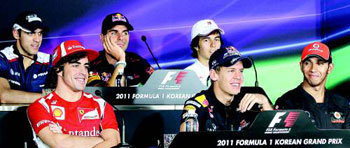 포뮬러 원(F1) 코리아 그랑프리 개막을 하루 앞둔 13일 대회 참가 선수들이 전남 영암의 코리아 인터내서널 서킷에서 기자회견을 가졌다. 앞줄 왼쪽부터 시계 반대 방향으로 페르난도 알론소(스페인), 제바스티안 페텔(독일), 루이스 해밀턴(영국), 세르히오 페레스(멕시코), 하이메 알게르수아리(스페인), 파스토르 말도나도(베네수엘라).