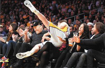 “被飛來的人身炸彈受驚嚇的觀眾!”26日在洛杉磯斯台普斯球館舉行的NBA常規賽洛杉磯湖人與芝加哥公牛的比賽中,湖人的特洛伊•墨菲為了搶籃板摔倒在觀眾席撞擊了一位女球迷。憑藉羅斯4.8秒的制勝球公牛1分險勝湖人。