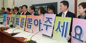 28일 국회에서 열린 민주통합당 최고위원회의에서 이용선 원혜영 공동대표 등이 당대표 및 최고위원 선출을 위한 선거인단 모집을 홍보하는 판을 들고 있다.