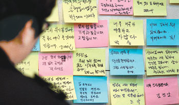 1日上午,已故金槿泰民主統合党常任顧問的位於首爾鐘路區首爾大醫院太平間入口有很多弔唁客留下的小紙條,上面寫著追悼金顧問的隻言片語。