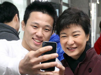 박근혜 한나라당 비상대책위원장(오른쪽)이 21일 서울 태릉선수촌을 방문해 런던 올림픽에 대비해 훈련 중인 국가대표 선수들을 격려했다. 박 위원장이 유도 왕기춘 선수와 휴대전화로 사진을 찍고 있다.