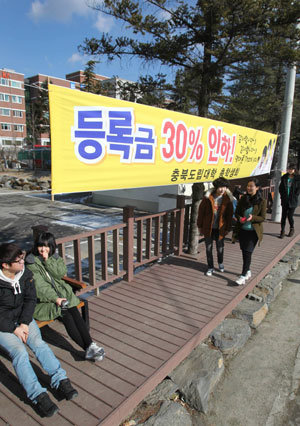 25日,忠北道立大學校園裡掛了學雜費下調30%的橫幅。該大學學生負擔的每學期實際入學費人文科是180萬韓元、理科是210萬韓元。