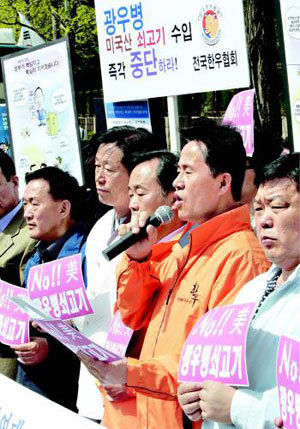 農畜產聯合會、韓國農民聯隊等畜產相關團體協議會所屬的40多個農畜產團體27日上午在政府果川大廈前面舉行記者會,要求:“立即中斷美國牛肉的進口。”