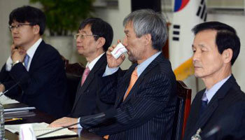 總統交接委員會國政企劃調整分科幹事庾民鳳(右側第二位)16日在首爾中老區三成洞韓國金融研究院舉辦的幹事團會上喝水。從右開始是金長壽外交國防統一分科幹事、庾幹事、政務分科幹事、姜錫勳國政企劃調整分科委員。