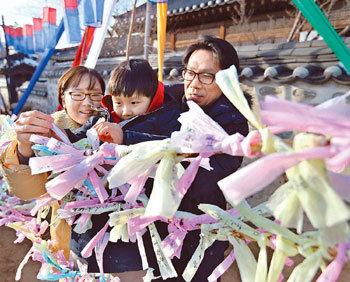 在首爾中區筆洞南山韓屋村,寫有新年願望的紙條一摞一摞地綁在了麻繩上。在春節假期最後一天,也就是2月11日,出來郊遊的大家族紛紛把寫有願望的紙條綁在了麻繩上。