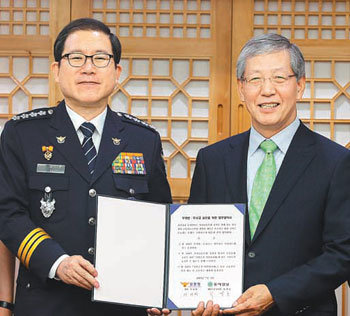 警察廳長李晟漢(左)和東亞日報代表理事副社長崔孟浩,於5日在首爾西大門區警察廳大樓裏簽署了為“善良駕駛Mileage”制度安頓的諒解備忘錄。