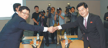 10日在開城工業園區綜合支援中心召開了第2次實務會談,會談開始前南方首席代表統壹部南北合作地區支援團長徐浩(左)和北方首席代表中央特區開發指導總局副總局長樸哲洙正在握手。