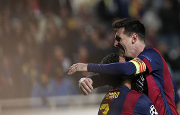 巴塞羅那俱樂部當家球星梅西(右側)於26日(韓國時間)2014-15賽季歐足聯(UEFA)歐冠聯賽F組壹場焦點戰在GSP球場展開爭奪,希臘人競技(塞浦路斯)主場迎戰巴塞羅那。比賽進行到下半場第42分鐘時,梅西進球之後與助攻羅德裏格斯壹起慶祝。
