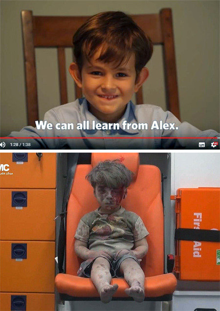 奧姆蘭·達革尼西(音譯)是一名五歲兒童,上個月17日在內戰中的敘利亞阿勒頗省遭到敘利亞政府軍和俄羅斯軍的轟炸,滿身塵土和鮮血地被送到急救車上。在轟炸中,他失去了比他大五歲的哥哥阿裏,但小小年紀並沒有哭泣,而是一臉懵懂的表情凝視著畫面,令人們感到心疼。奧姆蘭淒慘的樣子,被名為“阿勒頗媒體中心”的當地媒體報導後,傳遍了全世界。