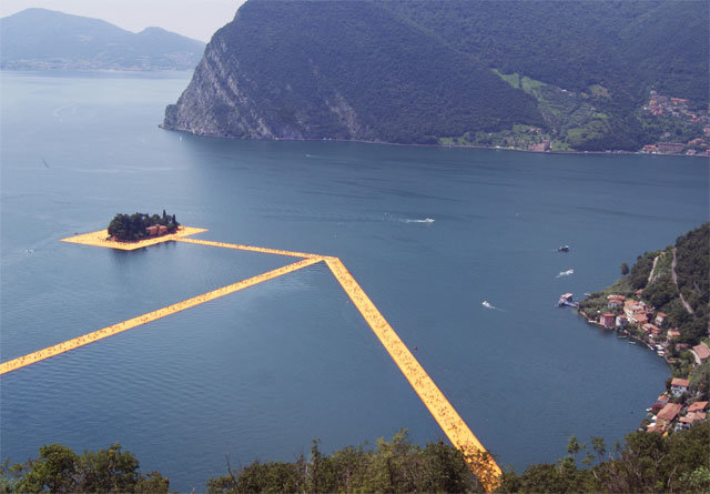 2016年夏天設置在意大利北部伊勢奧湖畔的“漂浮碼頭”,也是時隔46年實現1970年創意的項目。從蘇紮諾村開始,經過伊索拉山,直到聖保羅島,是壹條浮在上面上總長3公裏的散步道。由22萬個高密度聚乙烯立方體組合而成的步道,包上了10萬平方米的黃色布。這個特別的碼頭,壹夜之間改變了寧靜鄉村湖泊的風景,16天時間裏吸引了120萬人前來遊覽。這是當年創下世界最多觀眾紀錄的展覽。