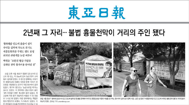 鐘路區30日表示:“在青瓦臺前噴水池附近人行道上非法搭建的9頂帳篷,從6月29日上午9點到11點,按照行政代理執行程序強制拆除。”全國公務員工會(全公會)、全國教職員工會(全教工)解雇者復職鬥爭委員會,要求釋放前統合進步黨議員李石基的團體等在這裏設置了帳篷。在行政代理執行之前,區裏曾給這些團體發過通告,要求他們“在6月29日上午8點之前主動拆除帳篷”,但他們並沒有主動拆除。本報在上個月27日曾報道稱,首爾市內到處都有長期擱置的非法帳篷,地方自治團體卻對此事聽之任之。