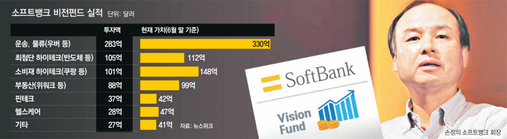 壹直以來,願景基金的投資選擇完全依賴於孫正義的感覺。他喜歡投資意味著企業價值超過10億美元的非上市企業的“獨角獸”企業。這就是為什麽以9月末為基準,軟銀向韓國Coupang、美國優步、威沃克、Slack、中國滴滴出行等全世界88家創業企業投資了約707億美元的原因。不過,優步和威沃克的虧損嚴重,Coupang也沒有取得什麽成績。
